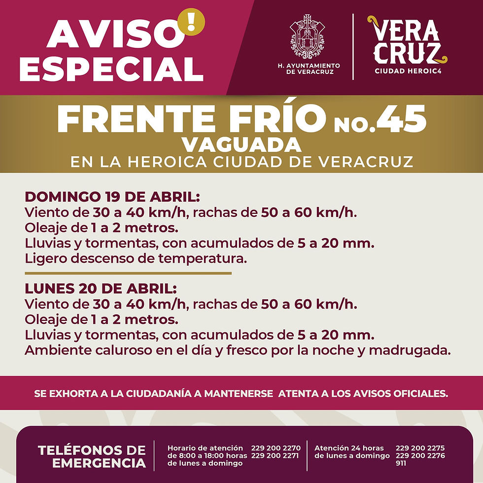 Debido a que durante este domingo 19 y lunes 20 de abril podrían presentarse vientos, lluvias y oleaje elevado por el paso del Frente Frío 45, la dirección de Protección Civil Municipal de Veracruz recomienda a la población tomar precauciones para evitar riesgos.